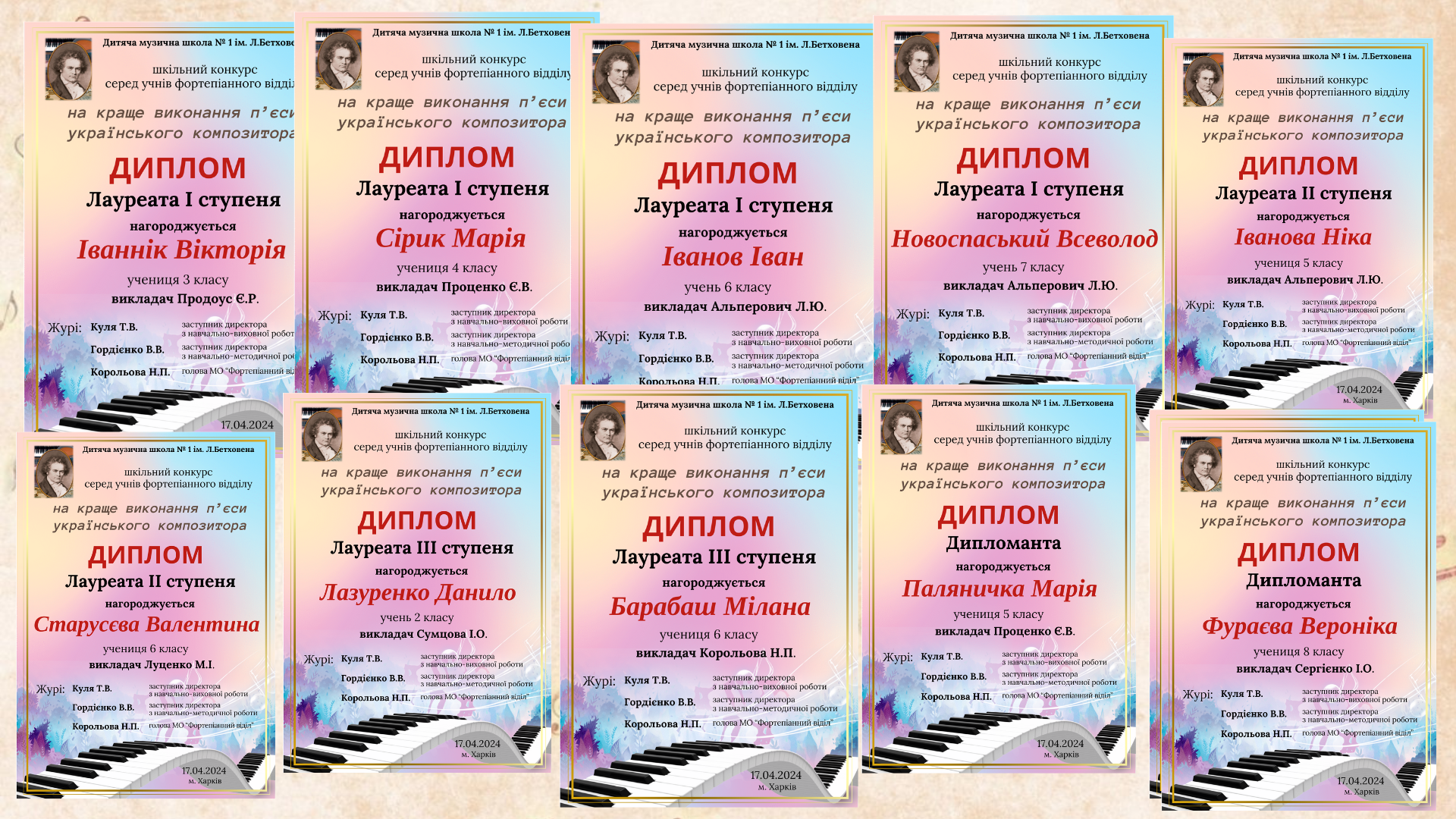 Іванов Іван, учень 6 класу (клас викладача Альперович Л.Ю.) – Лауреат І ступеня;
